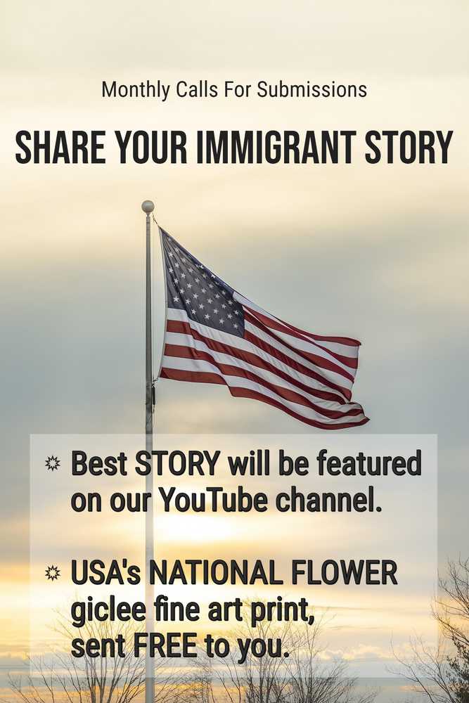 Your story is waiting to be told. The World’s National Flowers Project is an invitation to share your journey as an immigrant. Fill out our form to submit your finalized story to our monthly contest and have a chance to get your story featured.