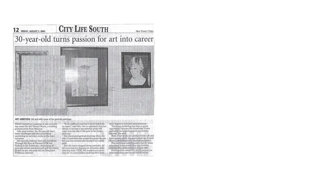 Shortly after I graduated, with a degree in Business Administration (Marketing) from MARA University of Technology in 2003, I had an opportunity to do my first solo exhibition, ‘Through My Eyes’, a portrait exhibition in pencil, pastel and colored pencil at a local gallery in Melaka.